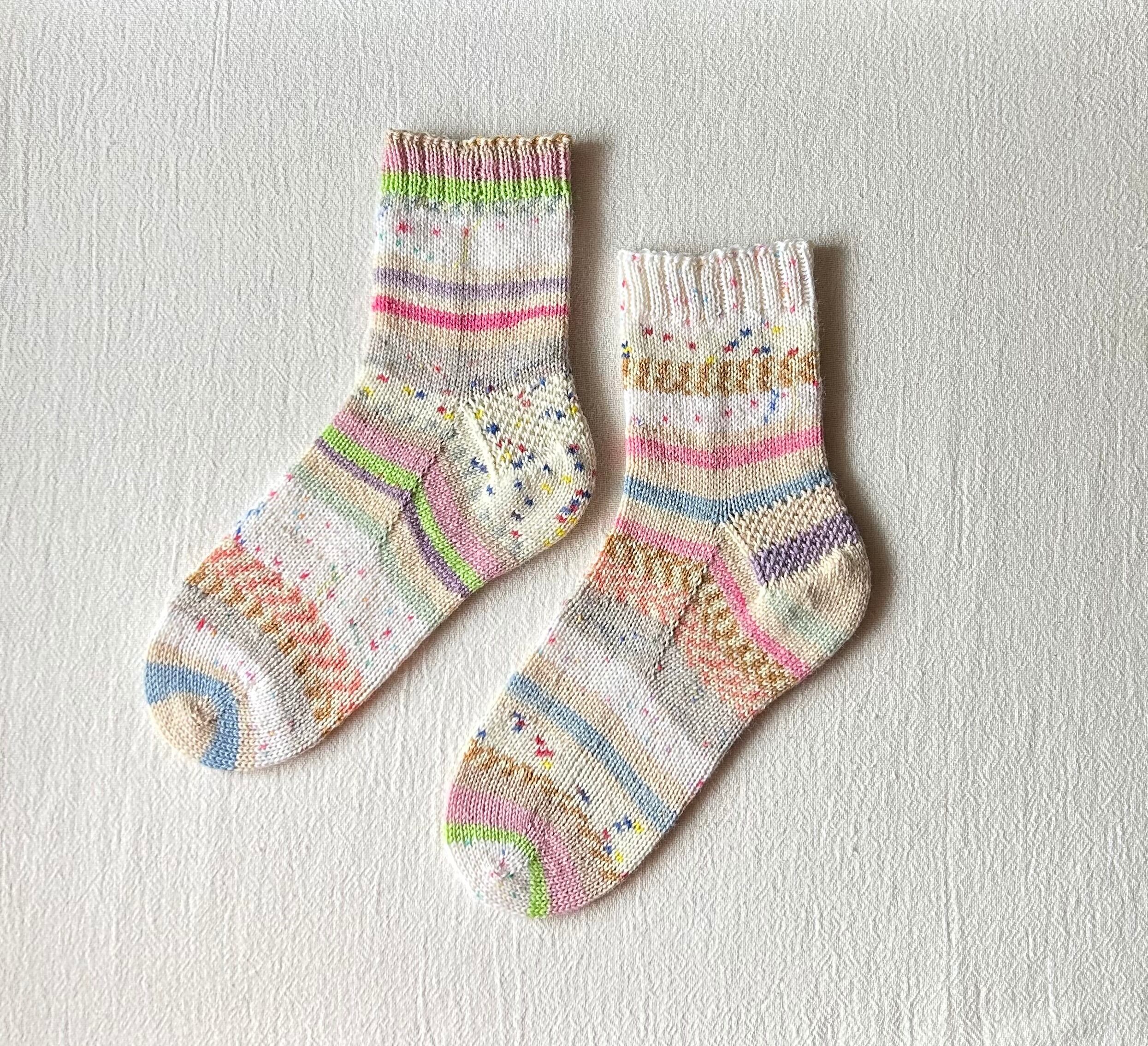 この靴下は、ハッピースクラッピーソックスと言って、『残り糸もハッピーに可愛い靴下に』という思いのこもった、世界に一つだけの靴下です。