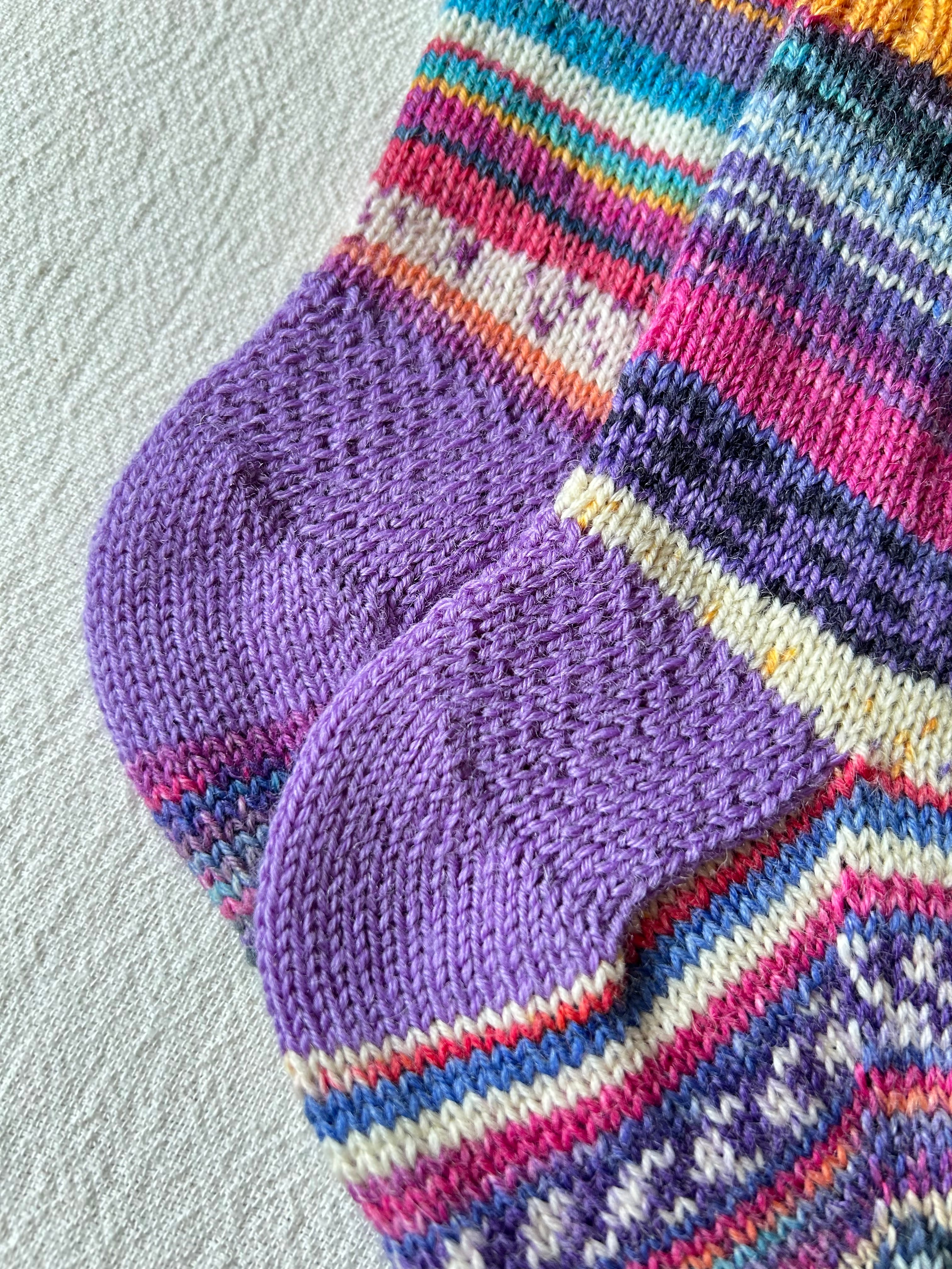 この靴下は、ハッピースクラッピーソックスと言って、『残り糸もハッピーに可愛い靴下に』という思いのこもった、世界に一つだけの靴下です。