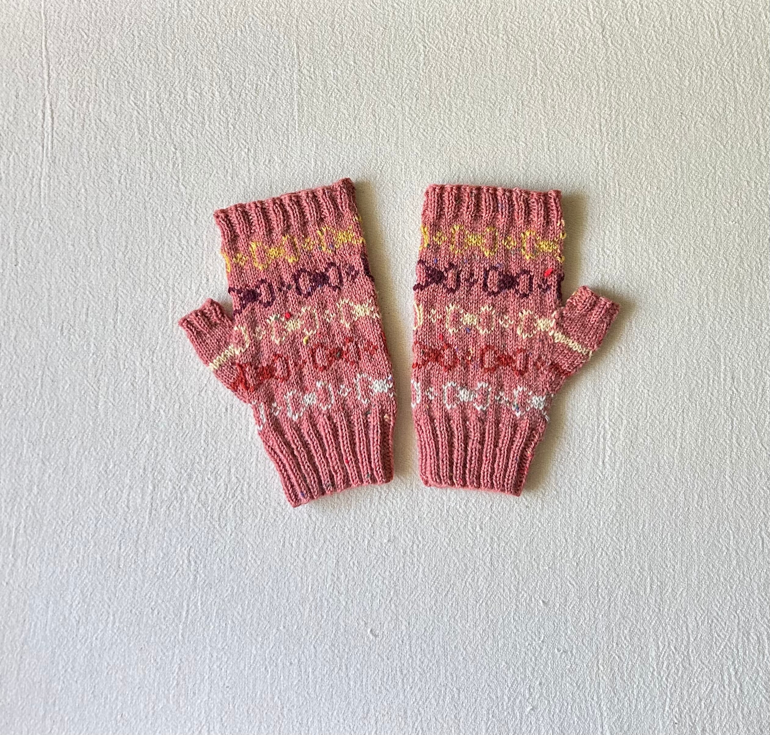 たくさんの毛糸を繋いだ、手編みのカラフルなハンドウォーマーです。