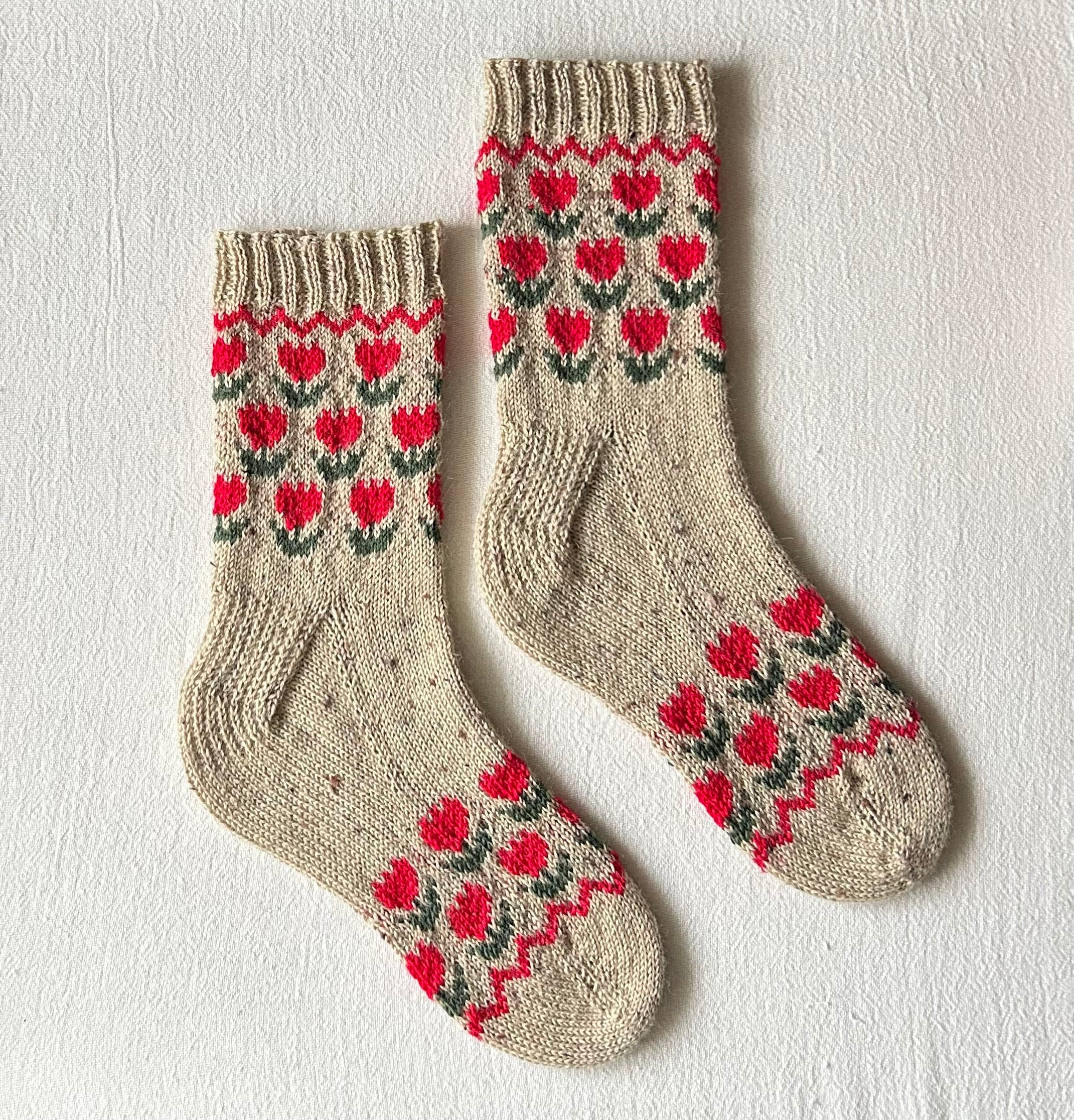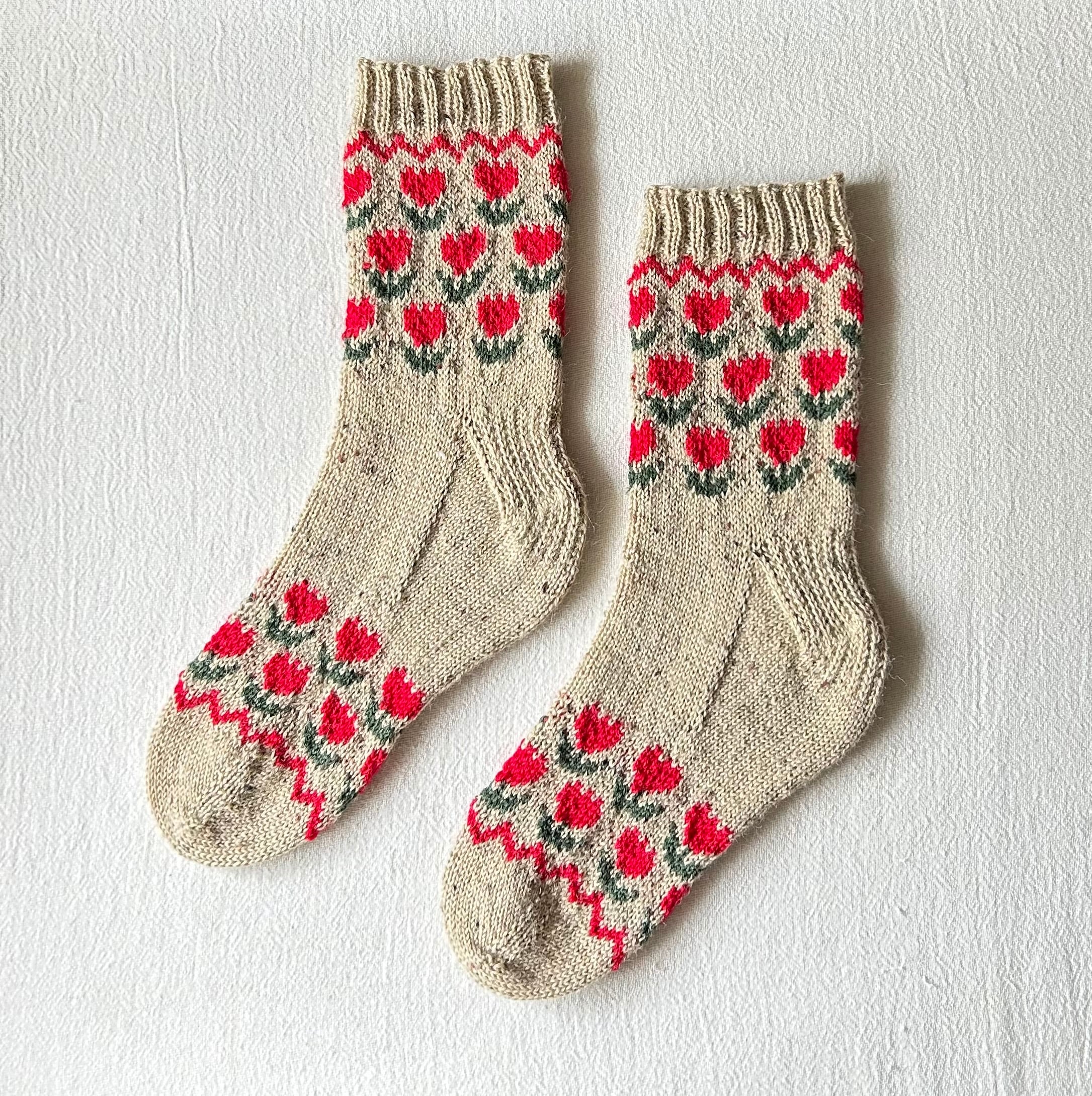 カラフルで個性的な手編み靴下、ぜんぶ“knit nikkoの世界”から生まれた作品たちです♩