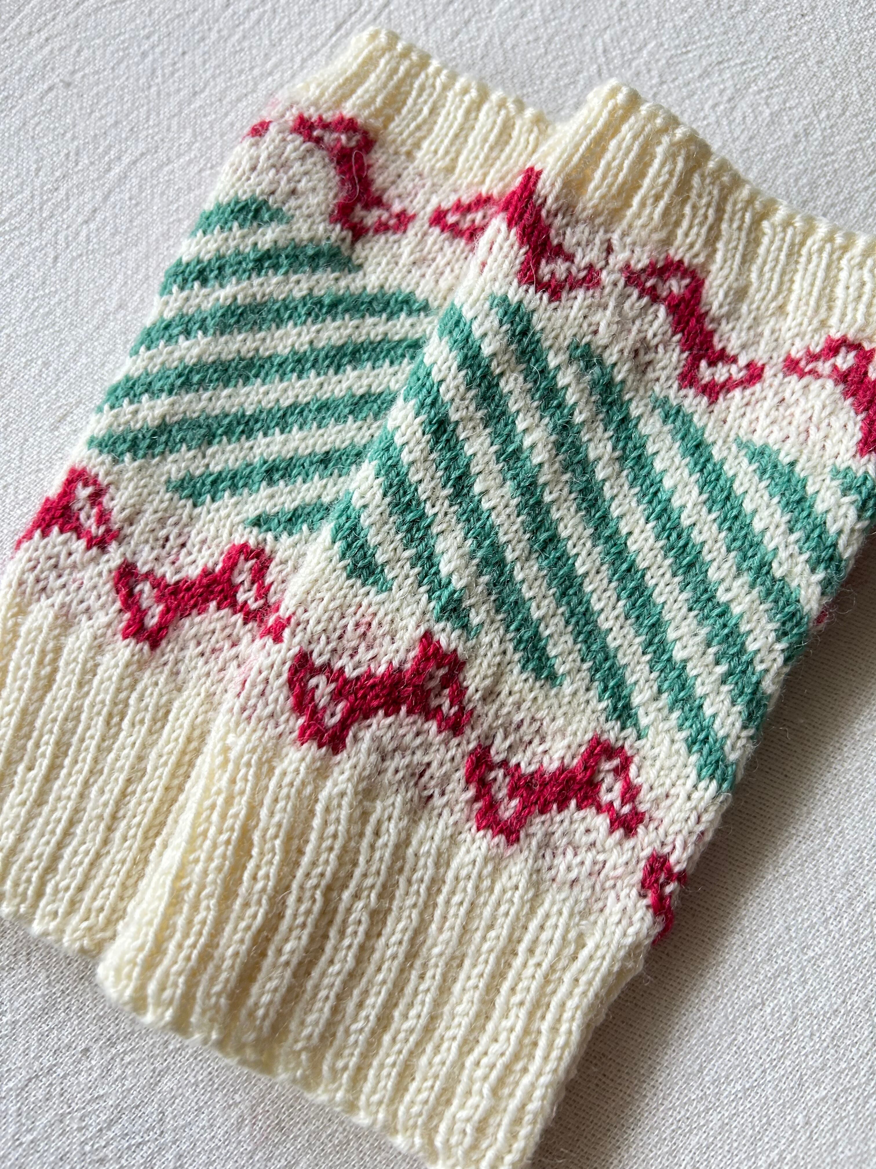 ふんわりと色が寄り添うように編まれた、カラフルな模様のハンドウォーマー。