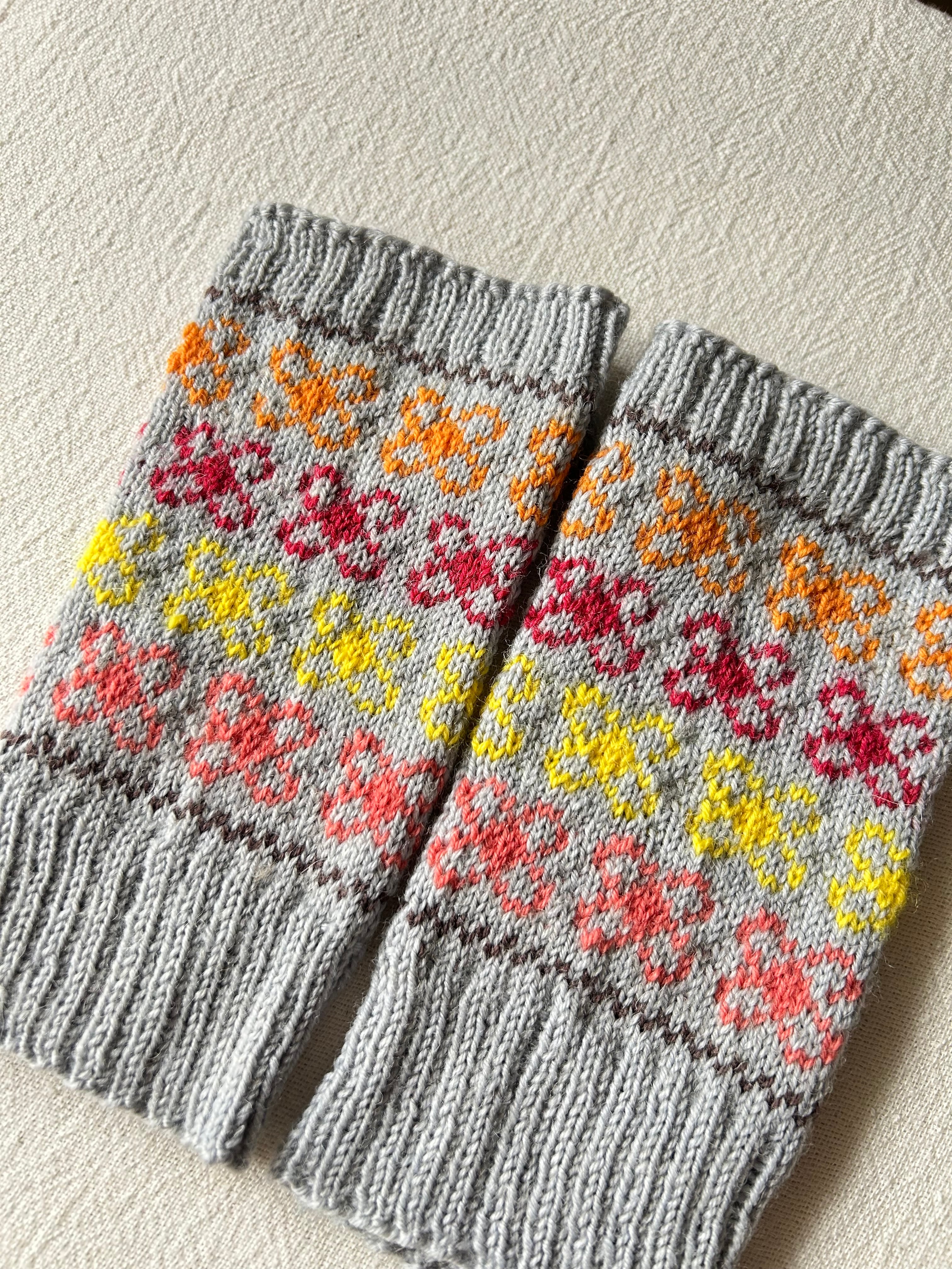 ふんわりと色が寄り添うように編まれた、カラフルな模様のハンドウォーマー。