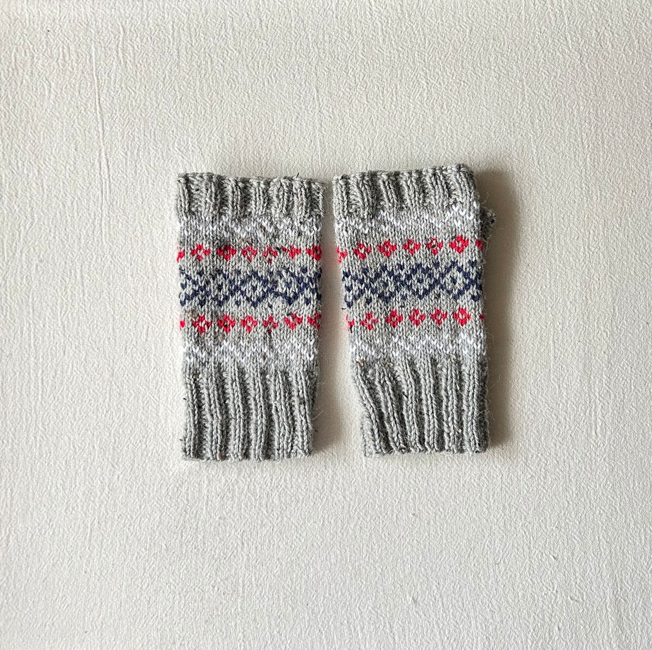 ふんわりと色が寄り添うように編まれた、カラフルな模様のハンドウォーマー。