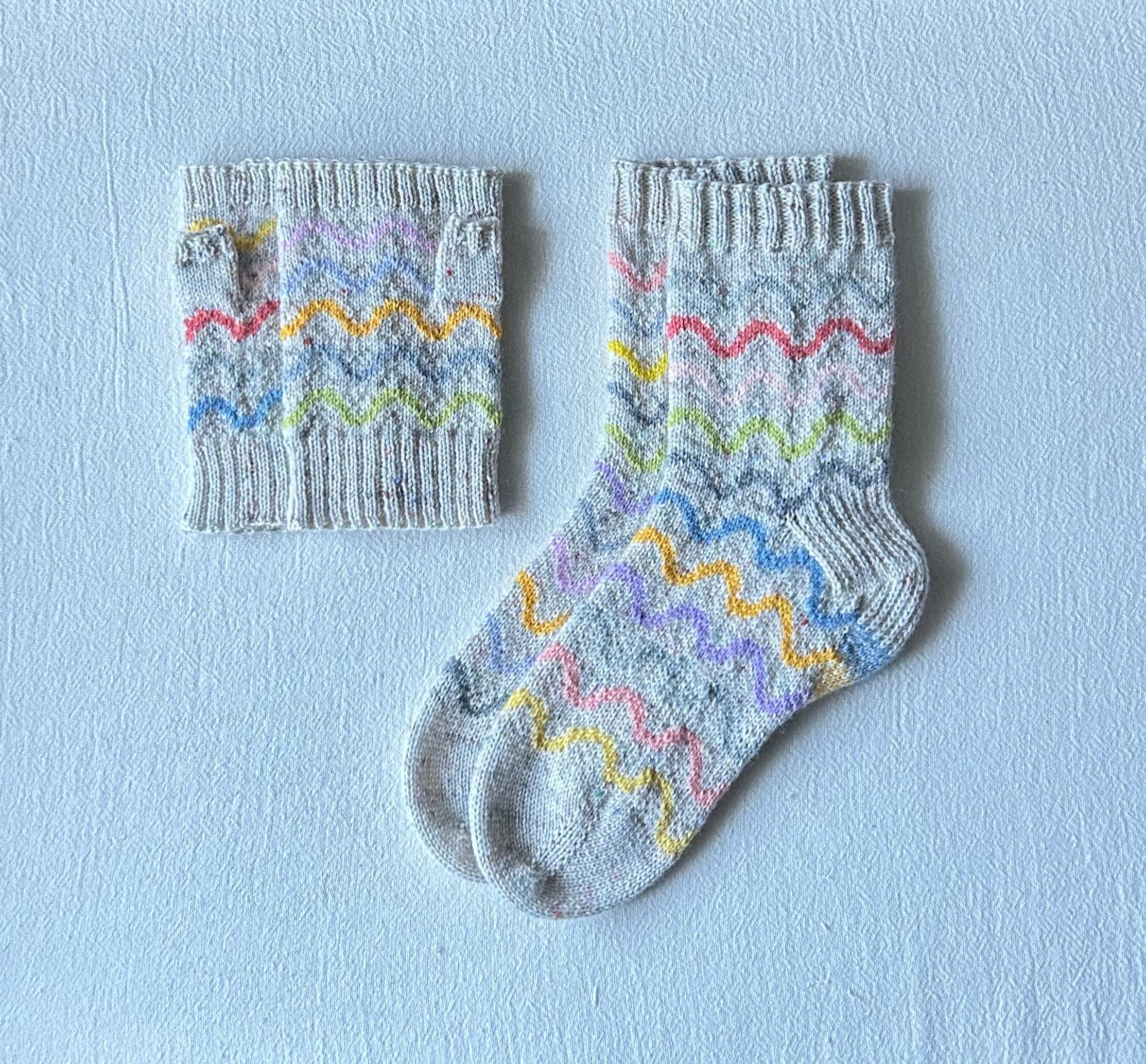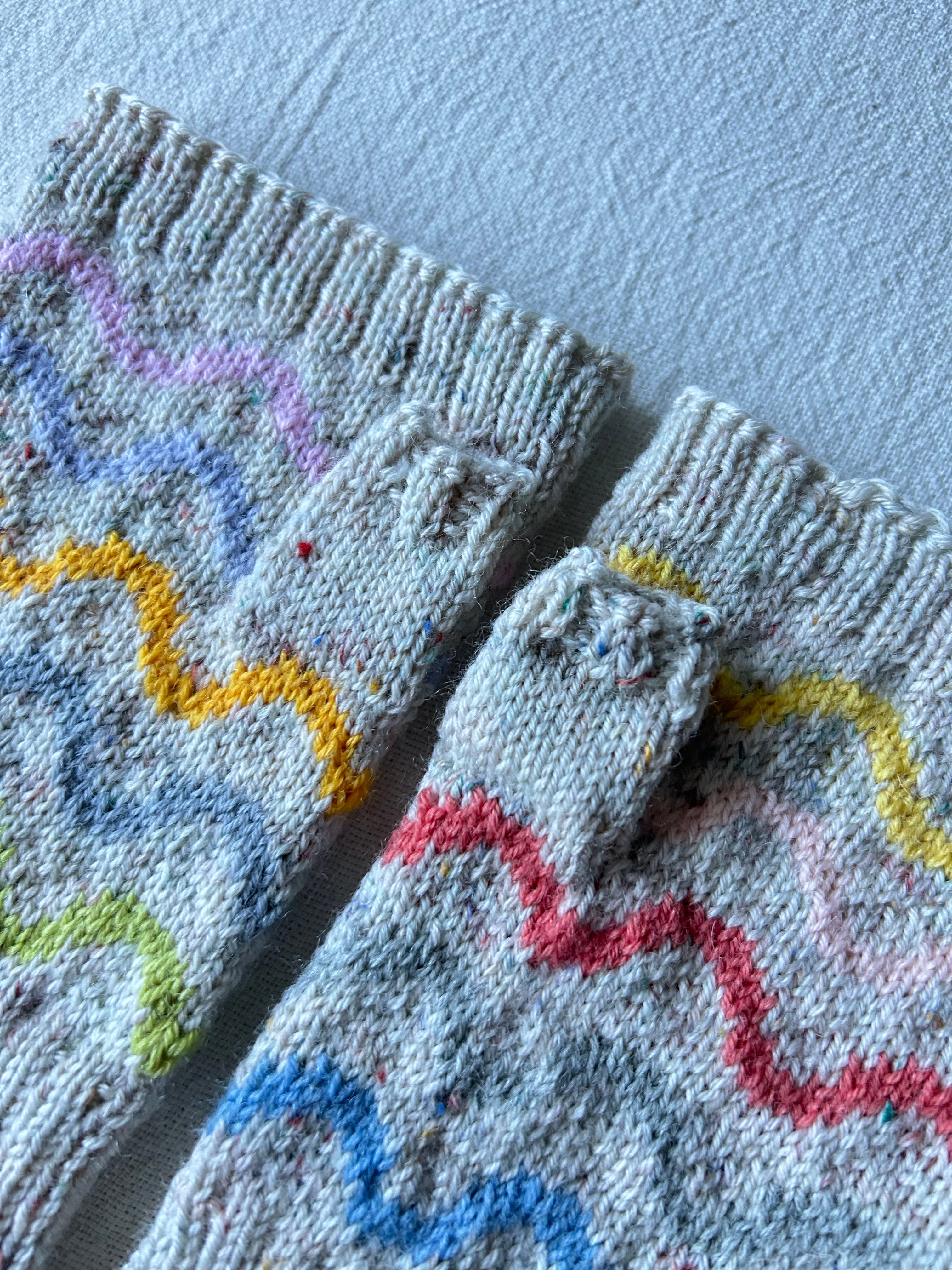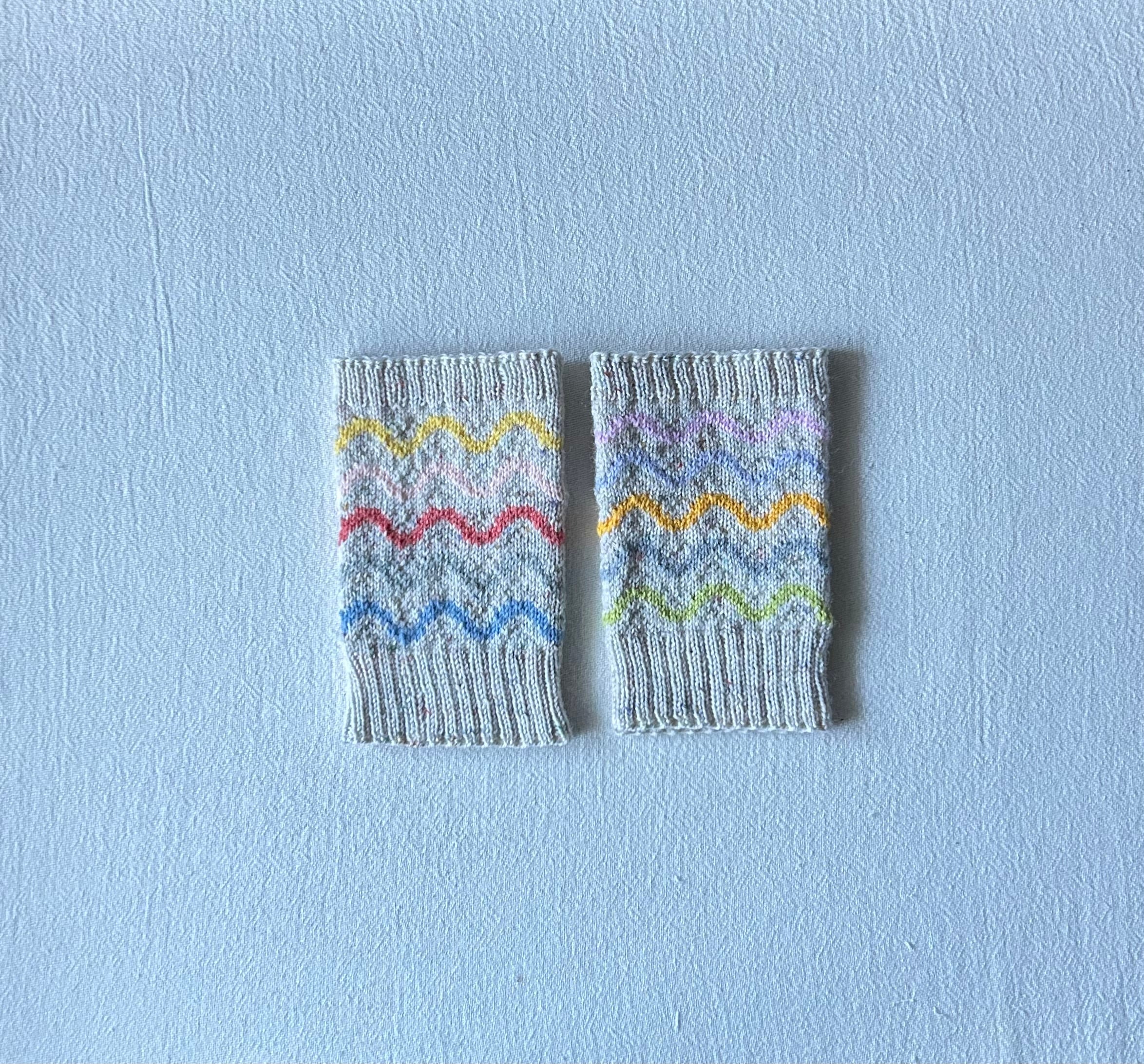ふんわりと色が寄り添うように編まれた、カラフルな模様のハンドウォーマー。