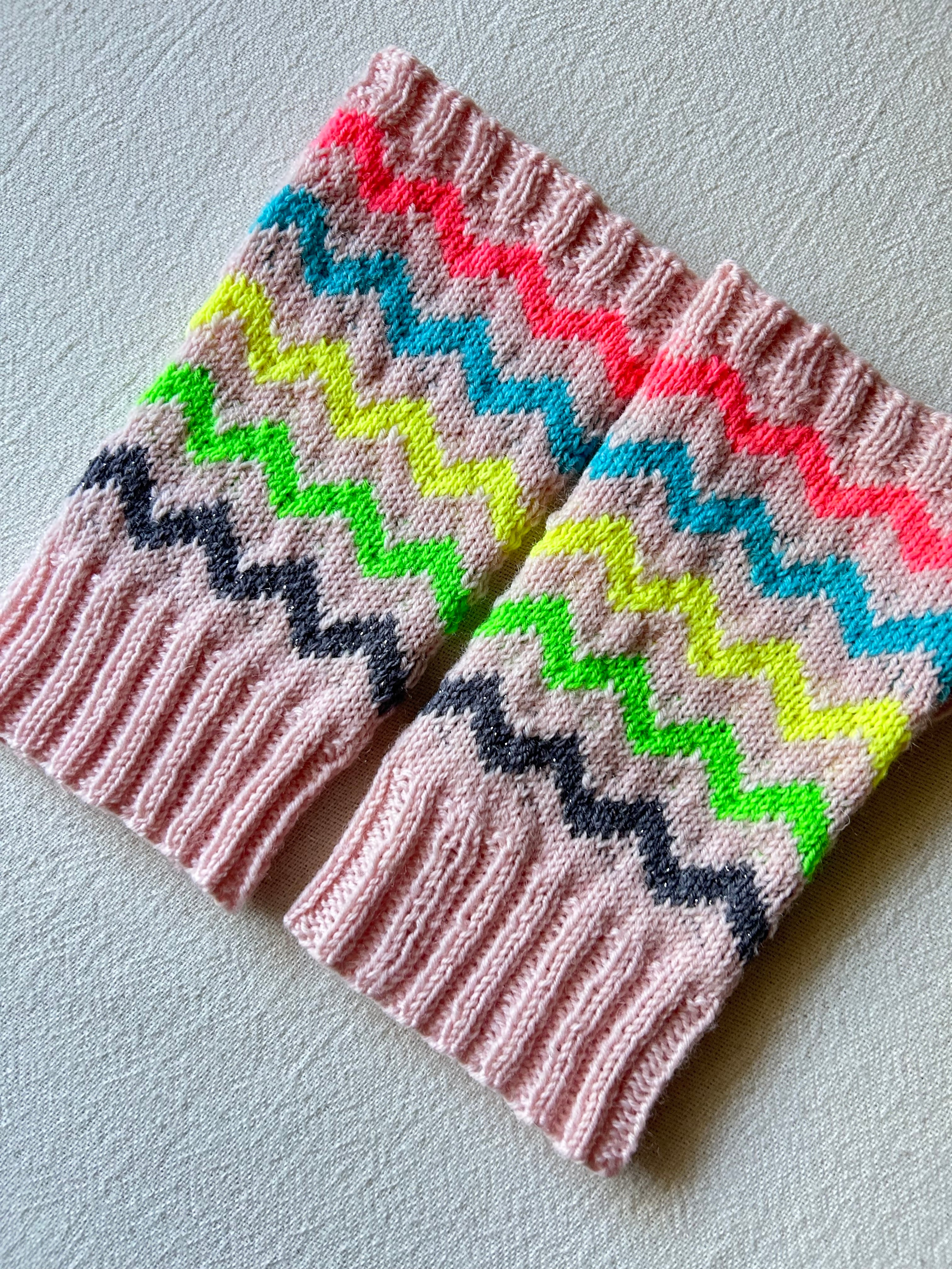 ふんわりと色が寄り添うように編まれた、カラフルな模様のハンドウォーマー。