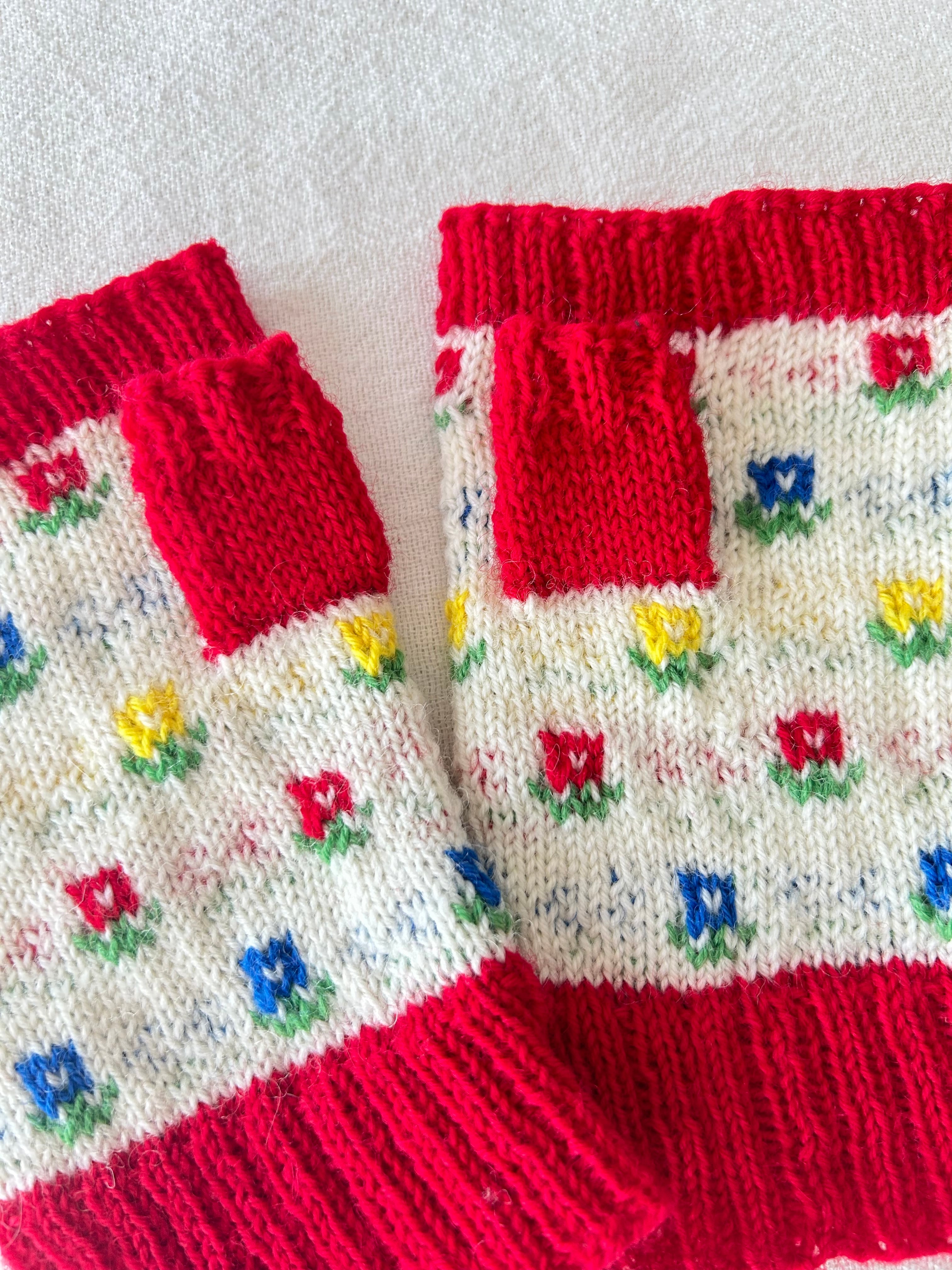 ふんわりと色が寄り添うように編まれた、カラフルな模様のハンドウォーマー。