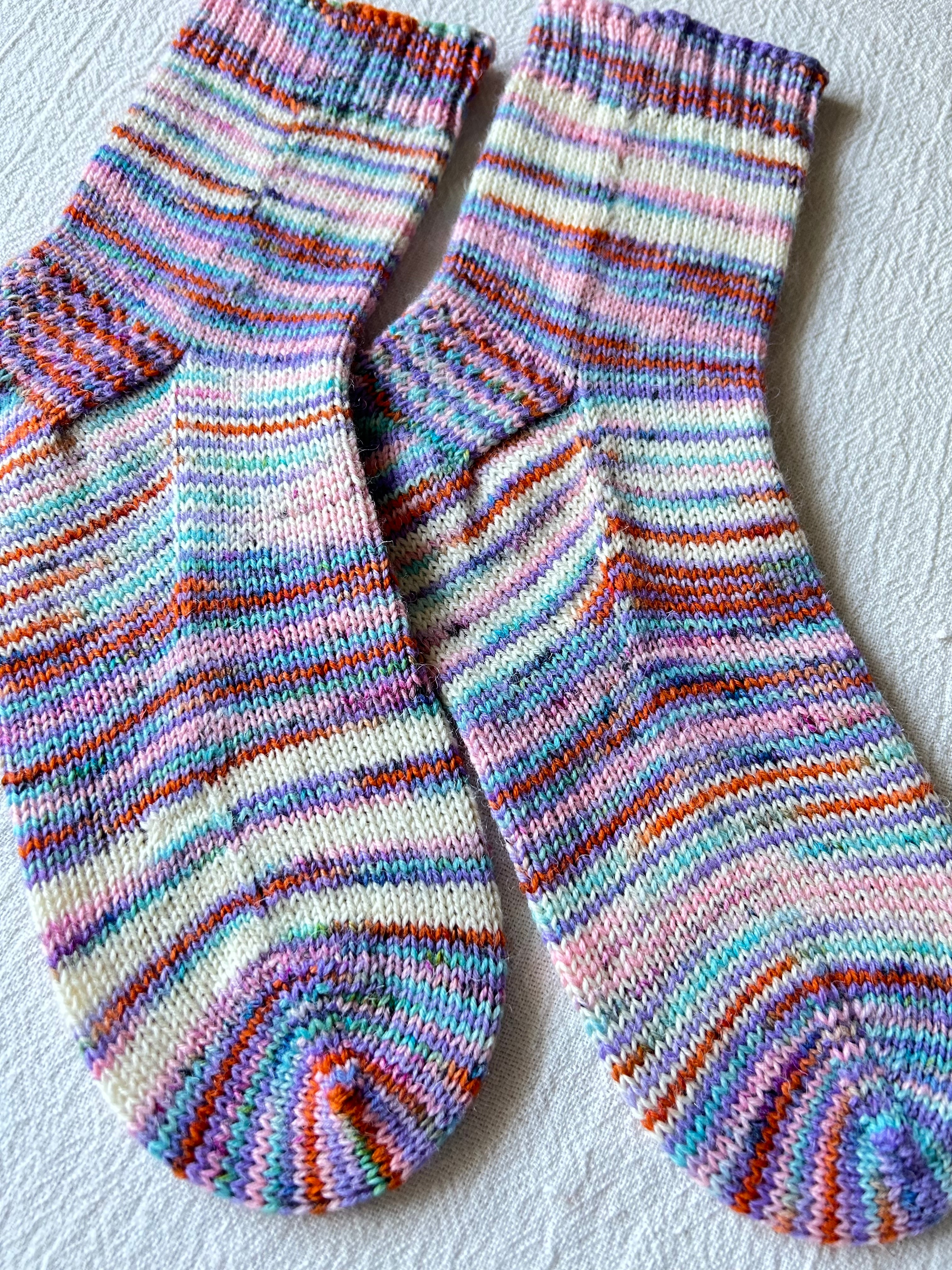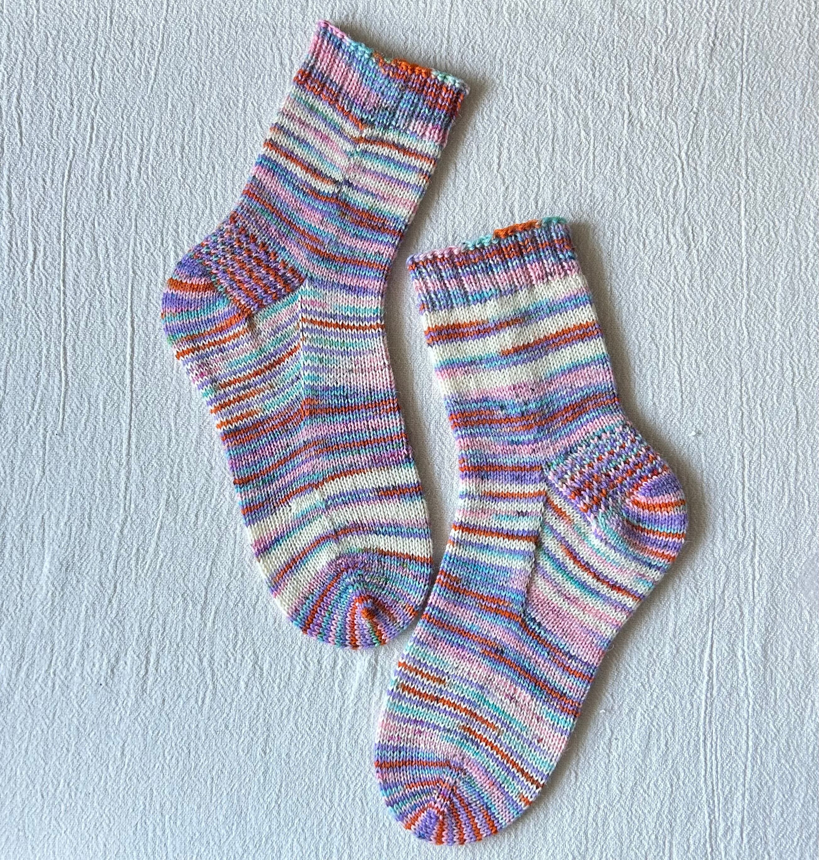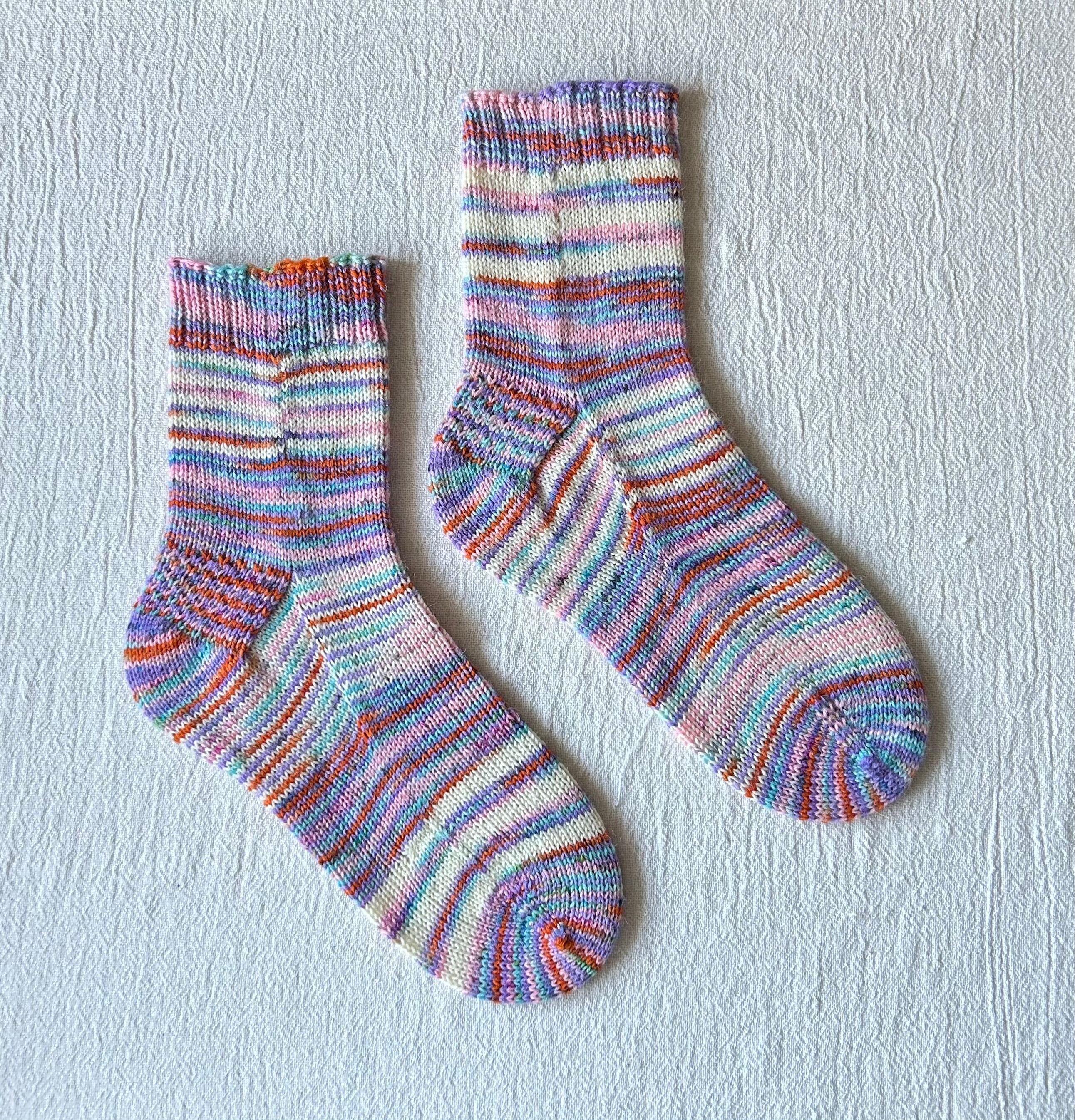 手染め毛糸と白の3種類の幅のストライプ模様が可愛い靴下です。
