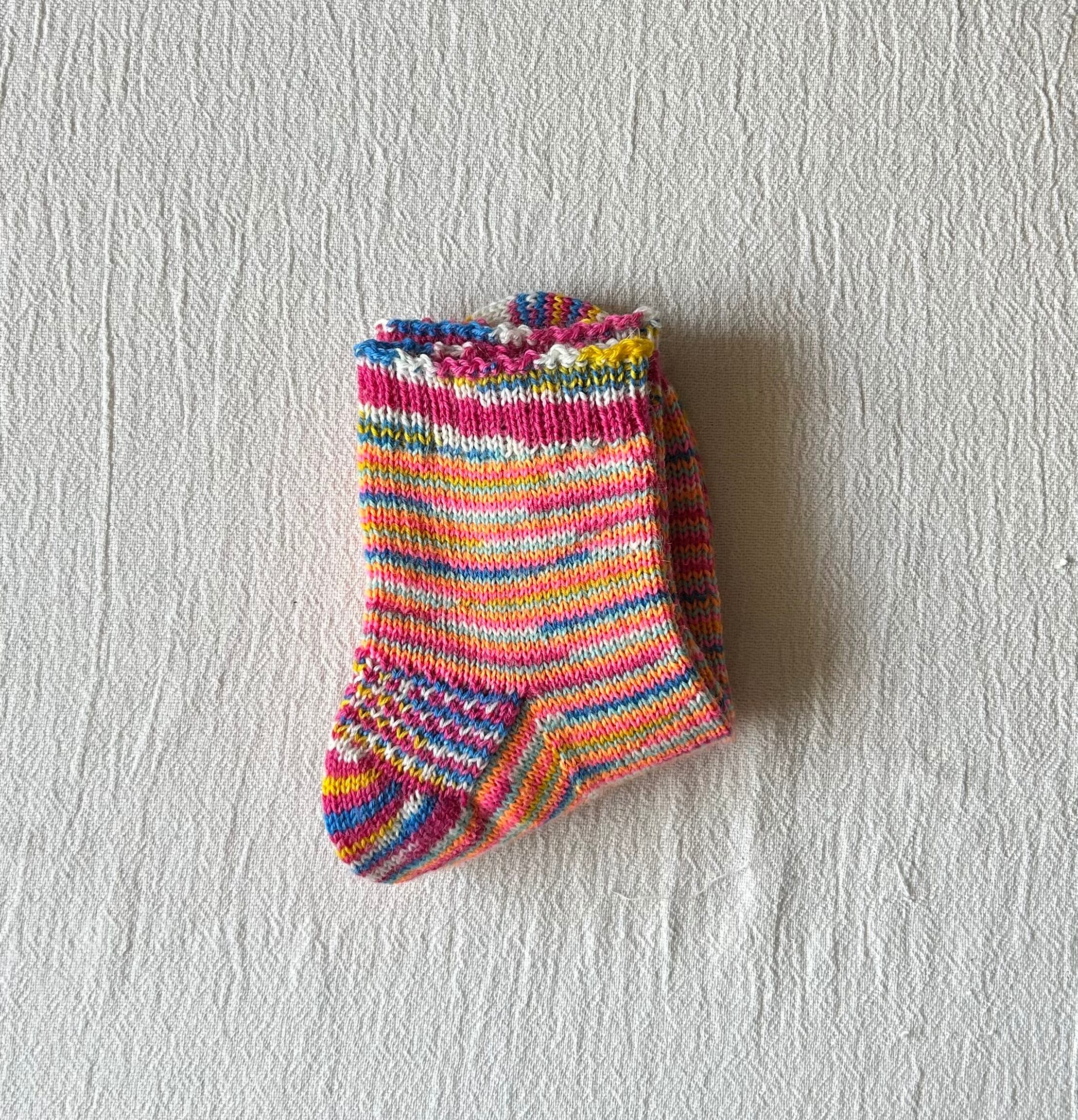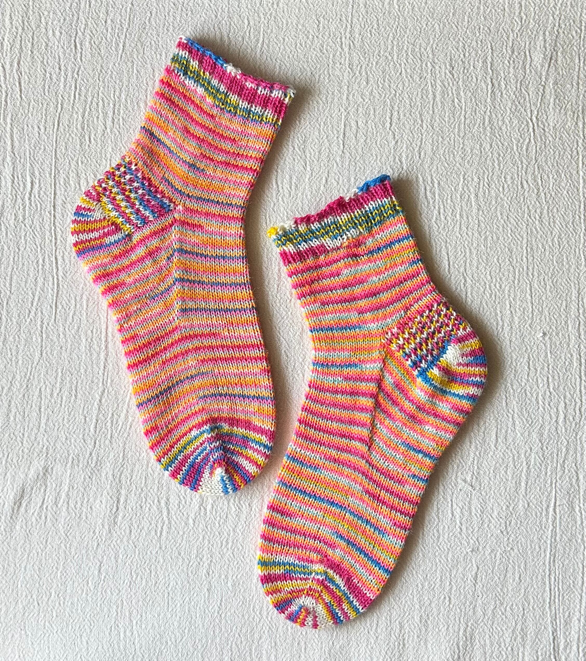 ネオンカラーとビビットカラーのランダムボーダーが可愛い靴下です。