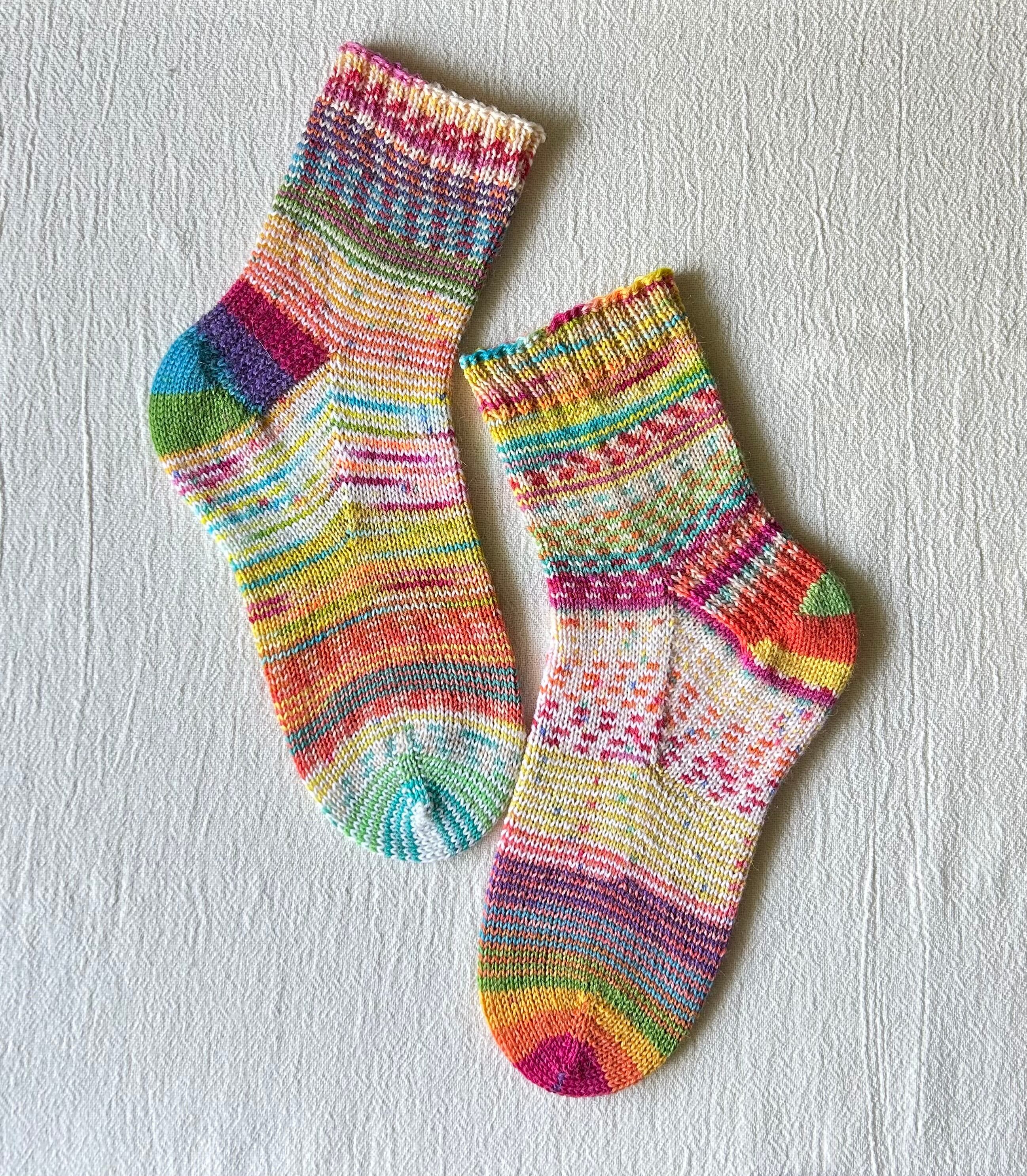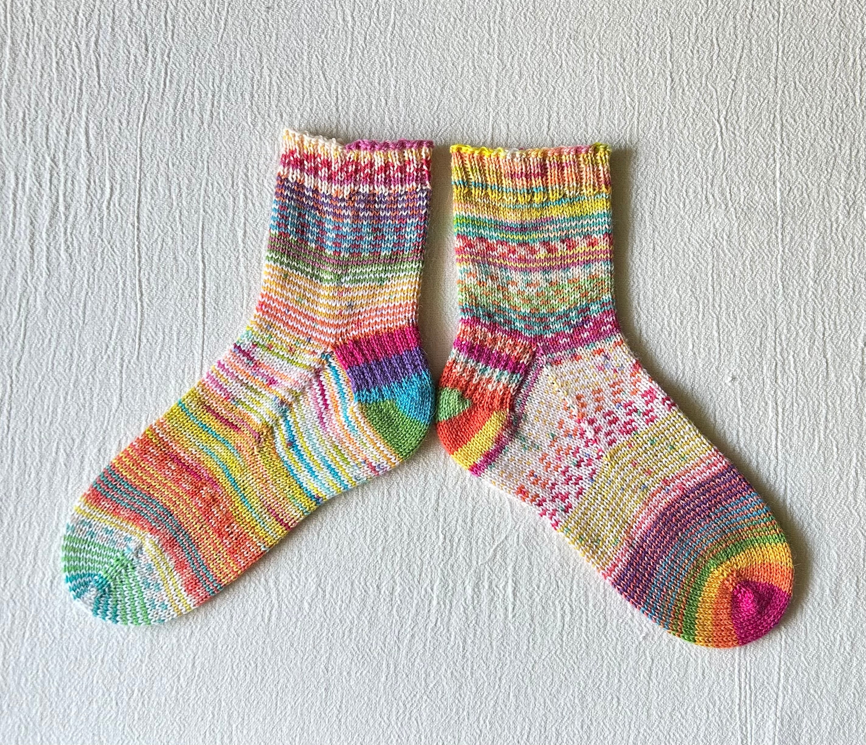 この靴下は、ハッピースクラッピーソックスと言って、『残り糸もハッピーに可愛い靴下に』という思いのこもった、世界に一つだけの靴下です。