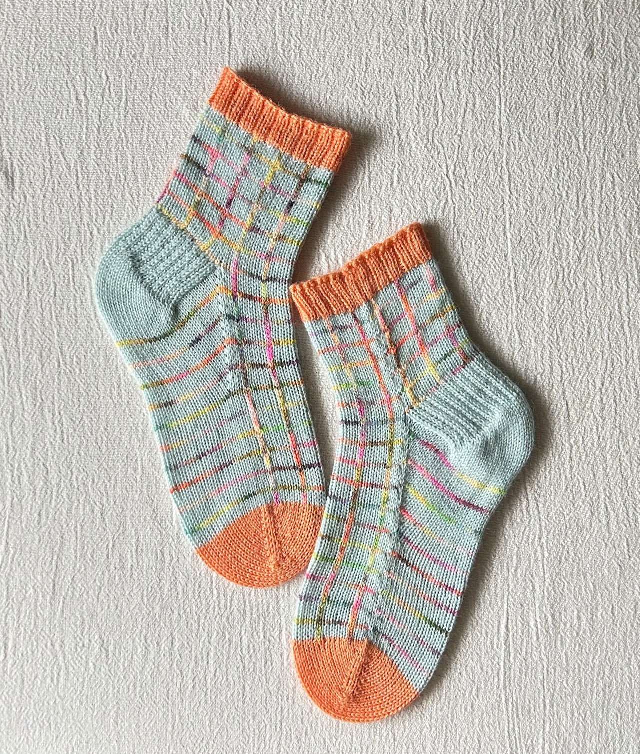 どこか懐かしいな色合いとチェックが相まってレトロな靴下になっています。