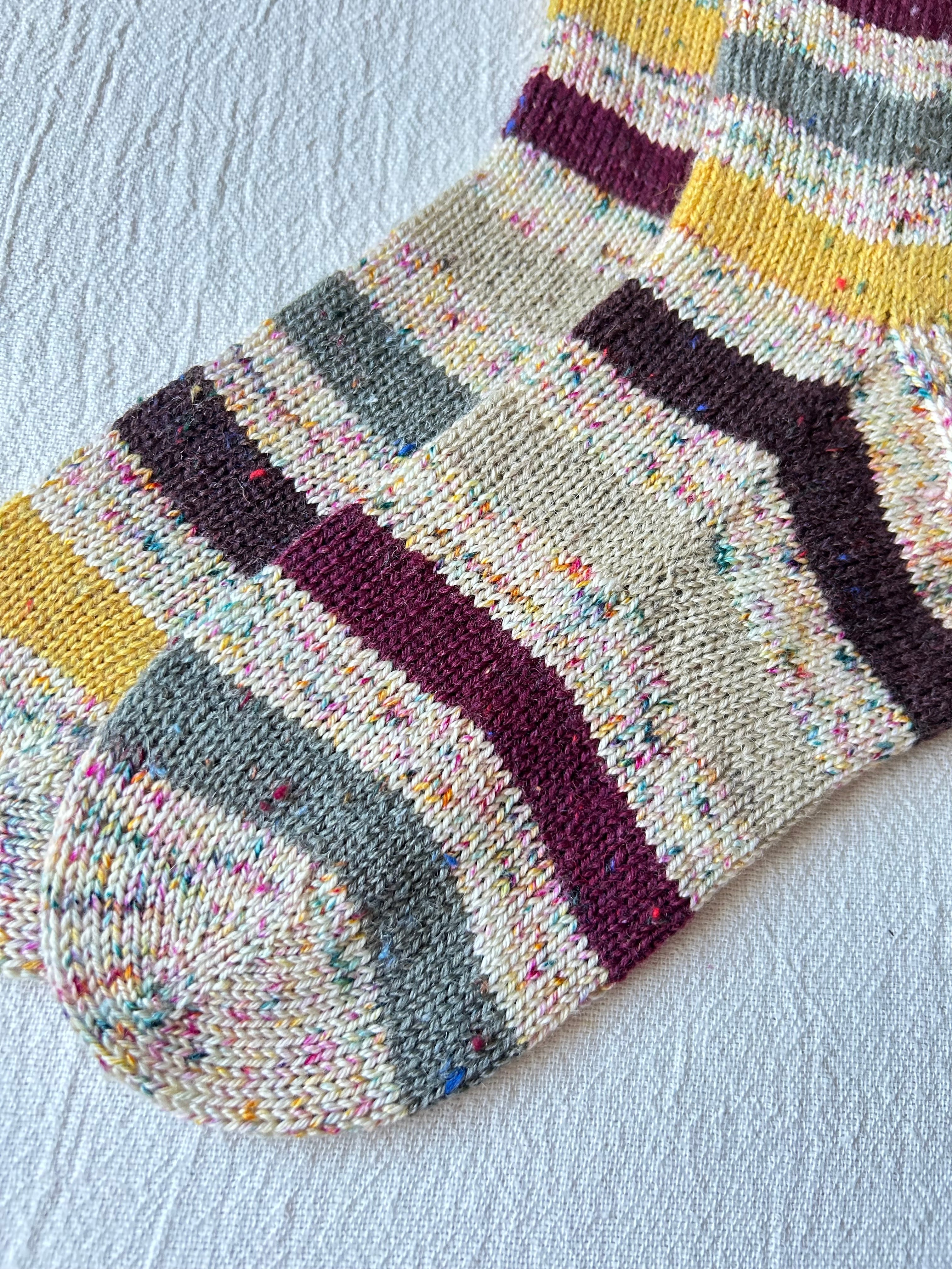 この靴下は、ハッピースクラッピーソックスと言って、『残り糸もハッピーに可愛い靴下に』という思いのこもった、世界に一つだけの靴下です。