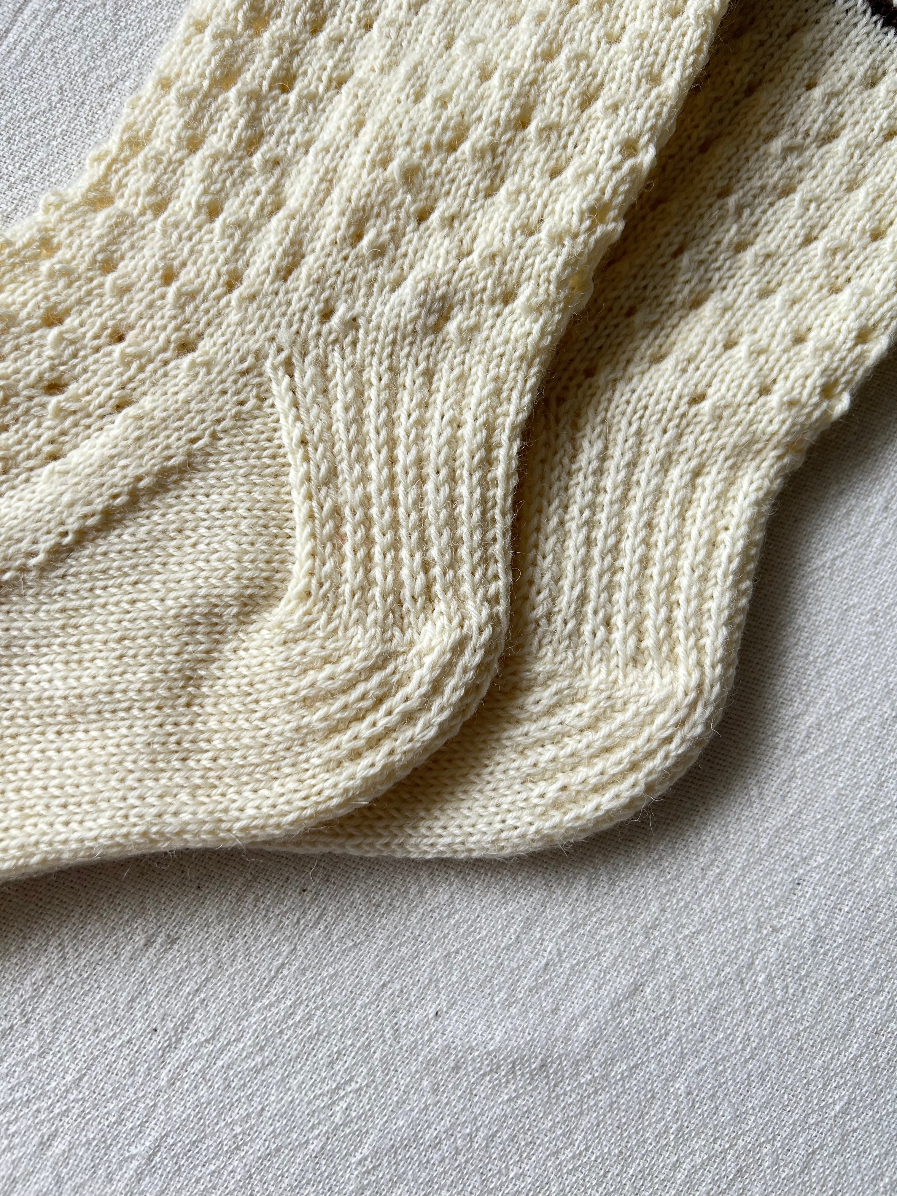 ドット模様の透かし編みを全体に施した、シンプルだけど遊び心のある靴下になりました。