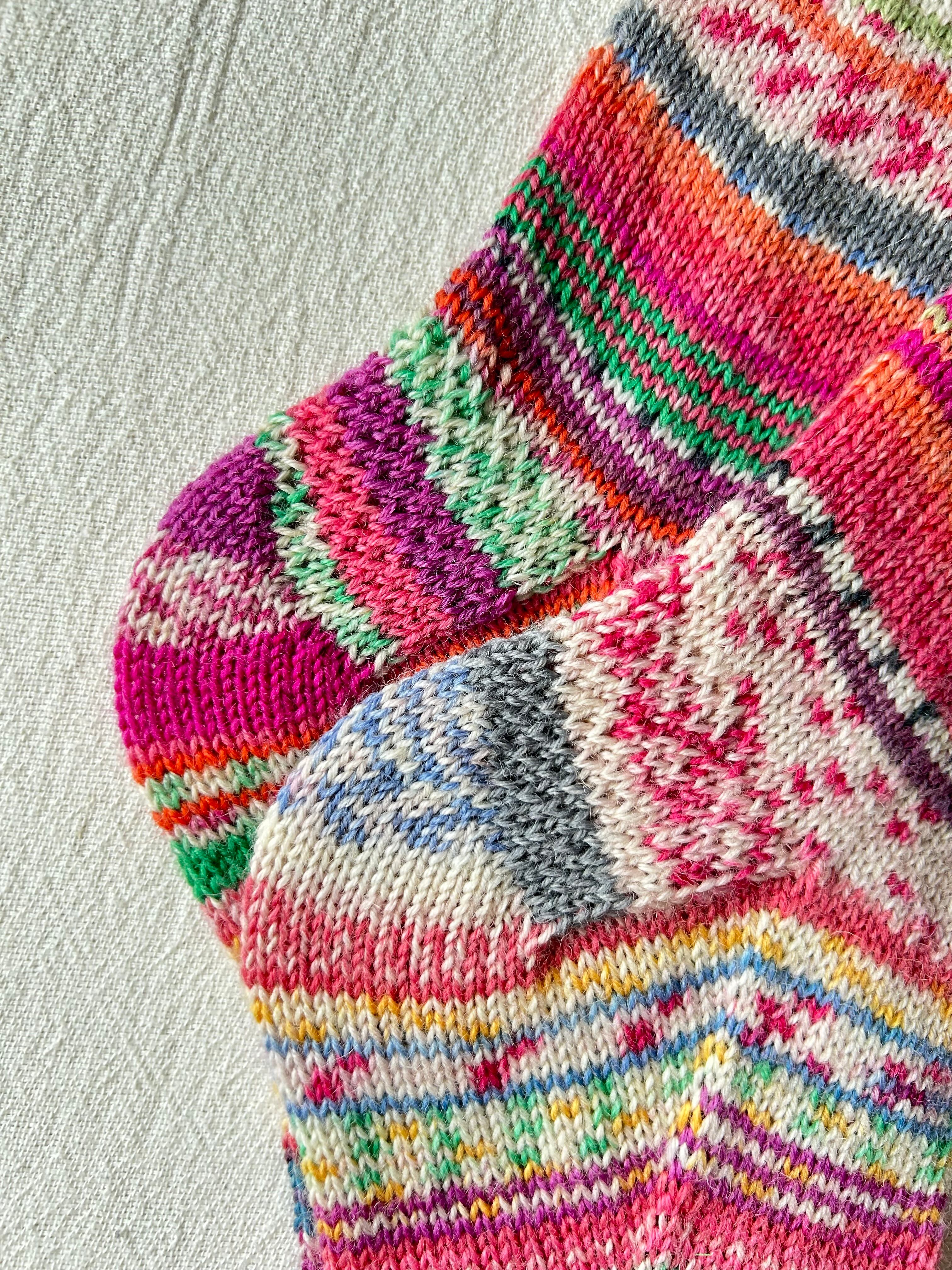この靴下は、ハッピースクラッピーソックスと言って、『残り糸もハッピーに可愛い靴下に』という思いのこもった、世界に一つだけの靴下です。