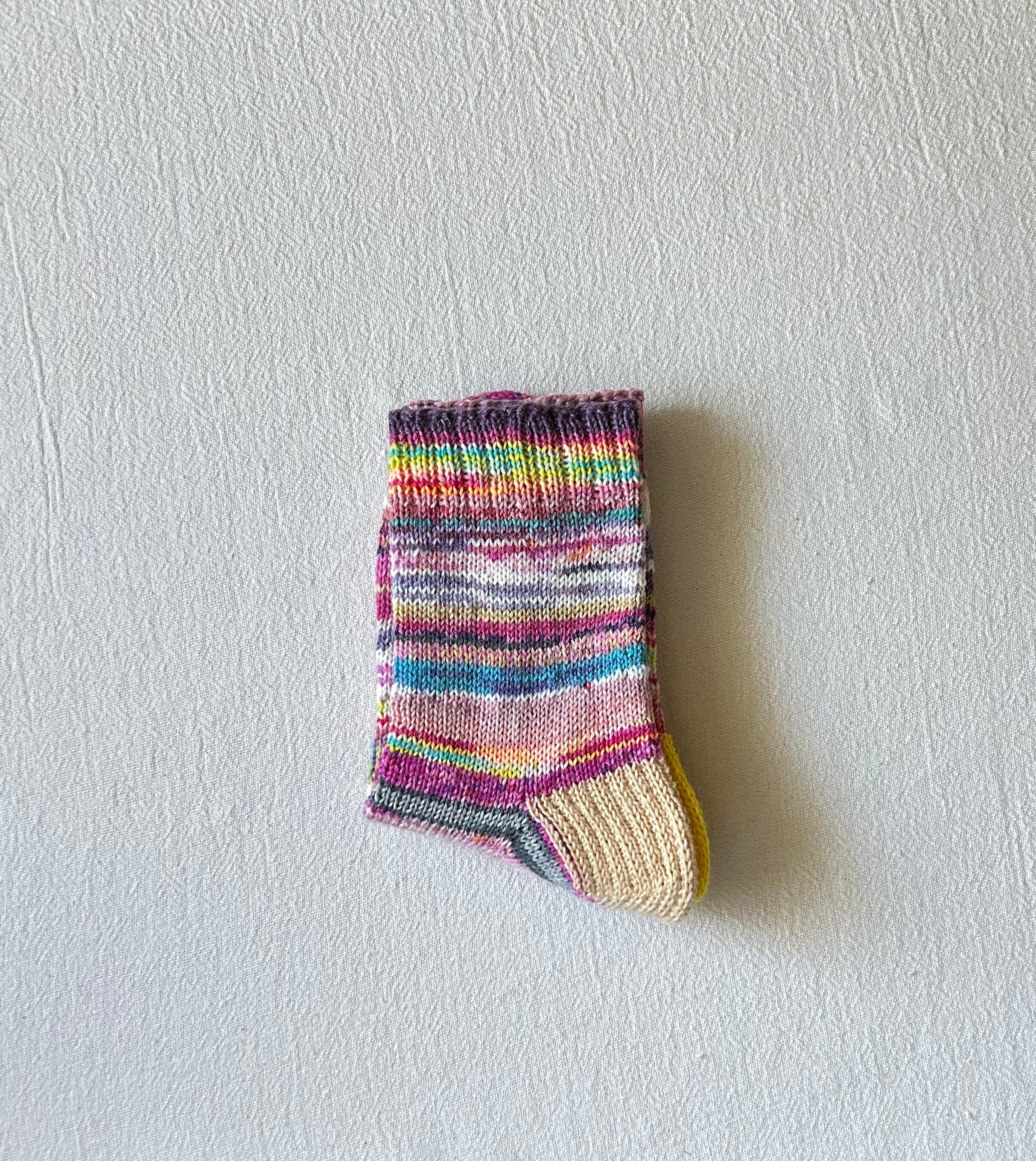 この靴下は、ハッピースクラッピーソックスと言って、『残り糸もハッピーに可愛い靴下に』という思いのこもった、世界に一つだけの靴下です。