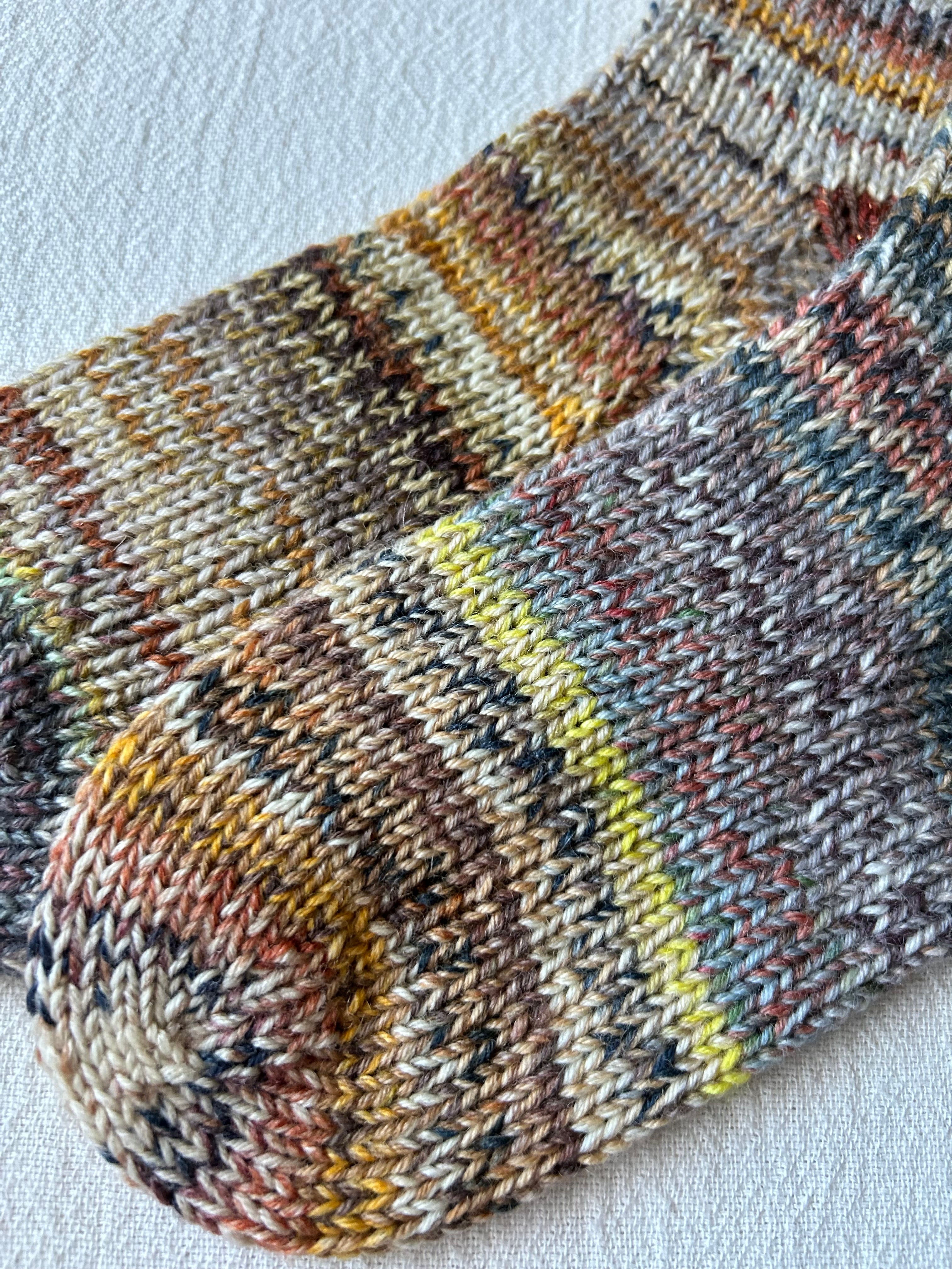 手編みのカラフルで厚手の靴下です。