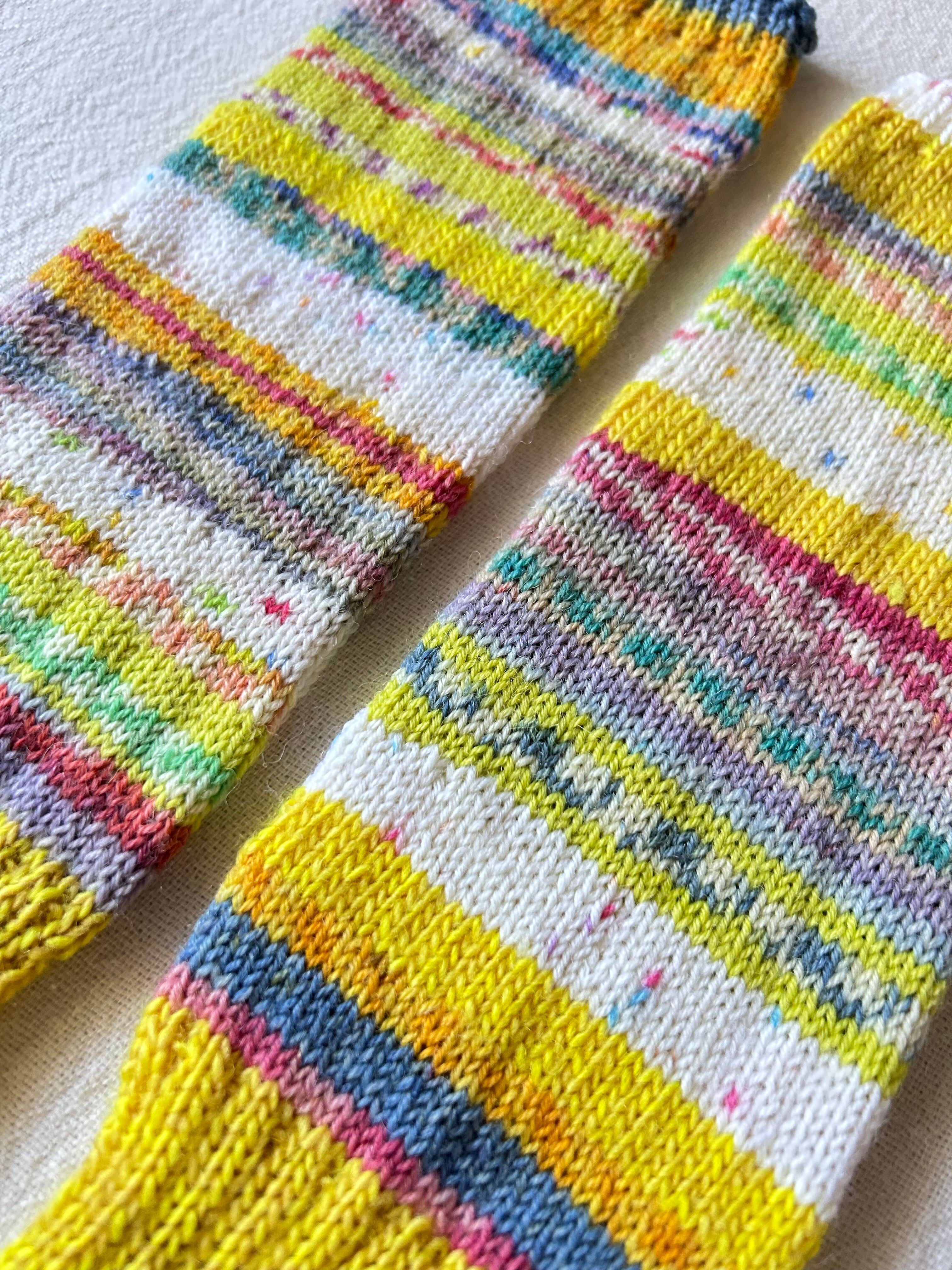 たくさんの毛糸を繋いだ、手編みのカラフルなハンドウォーマーです。