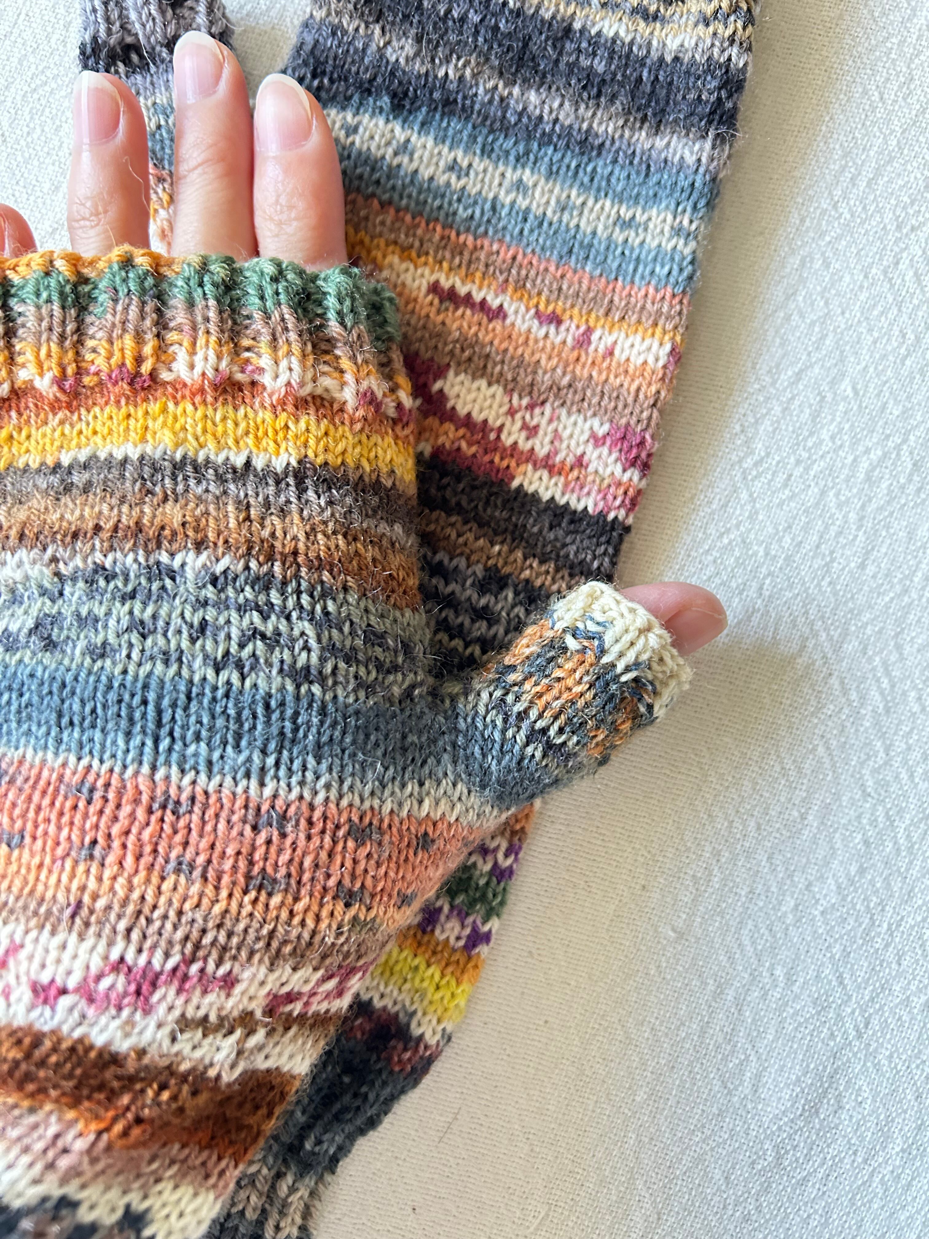 たくさんの毛糸を繋いだ、手編みのカラフルなハンドウォーマーです。